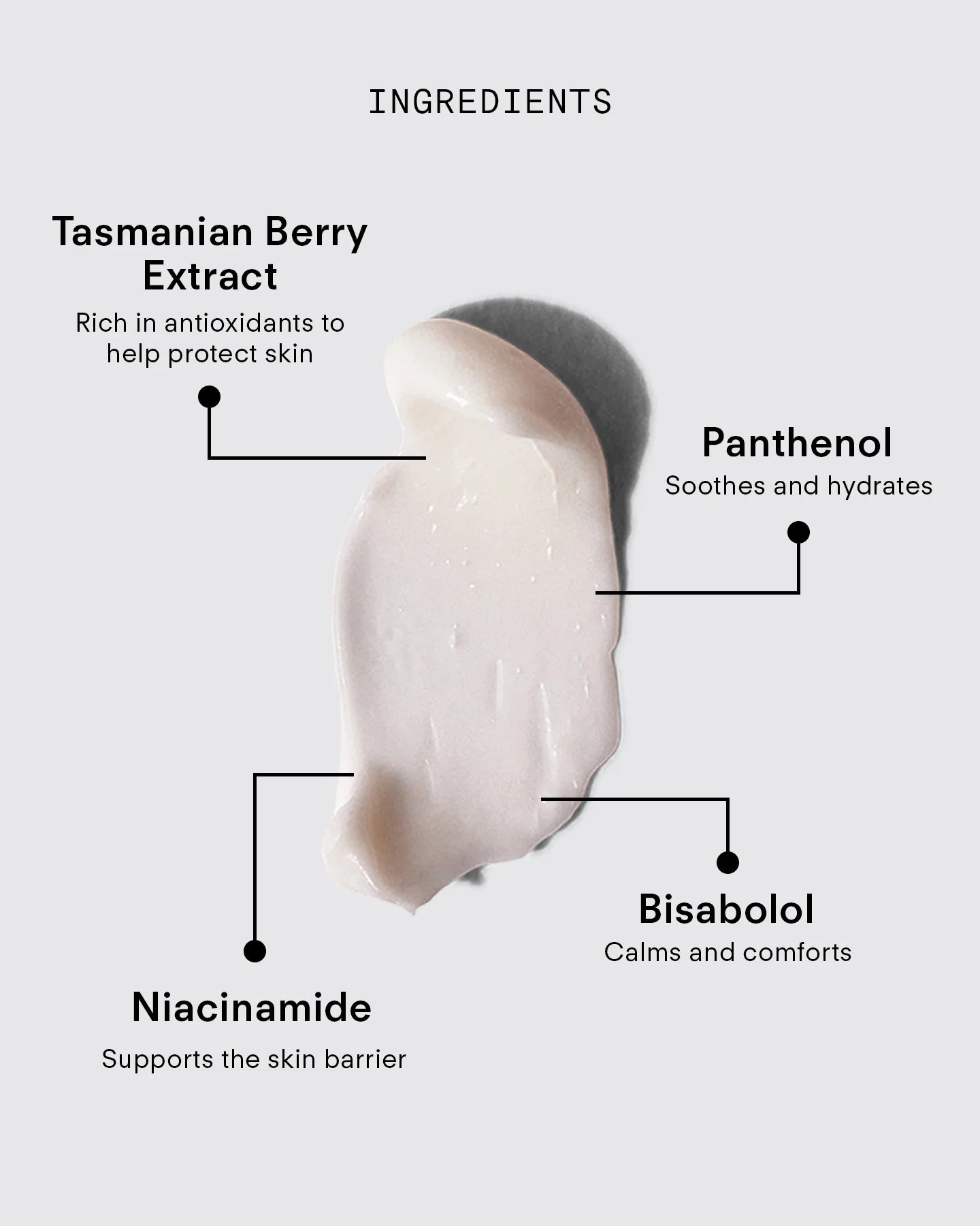Enriched with Bisabolol, Allantoin, Tasmanian Berry Extract Vitamin E Phosphates, offering a cooling, comforting effect while helping to protect the skin’s natural moisture barrier.